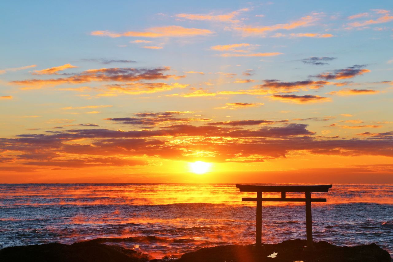 大洗矶前神社是一座古老的神社,相传创建于856年。鸟居矗立在神社前面的巨石之上,传说曾是神明降临过的地方,因而它既是日本人所谓的能量景点,充满着大地的神奇之力,也是绝佳的拍照点。从鸟居前方那波涛汹涌的海面升起的旭日,充满了朝气和能量,显得格外神圣。每年元旦,神职人员都要来这里奉拜新年的第一轮日出。