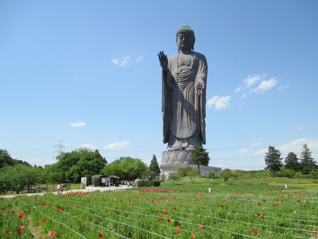 底座高20米,立像高100米的巨型佛像。这是全世界最大的青铜立像,已获得吉尼斯世界纪录认证。即使底座高度不计算在内,佛像高度也是自由女神像(40米)的2.5倍。