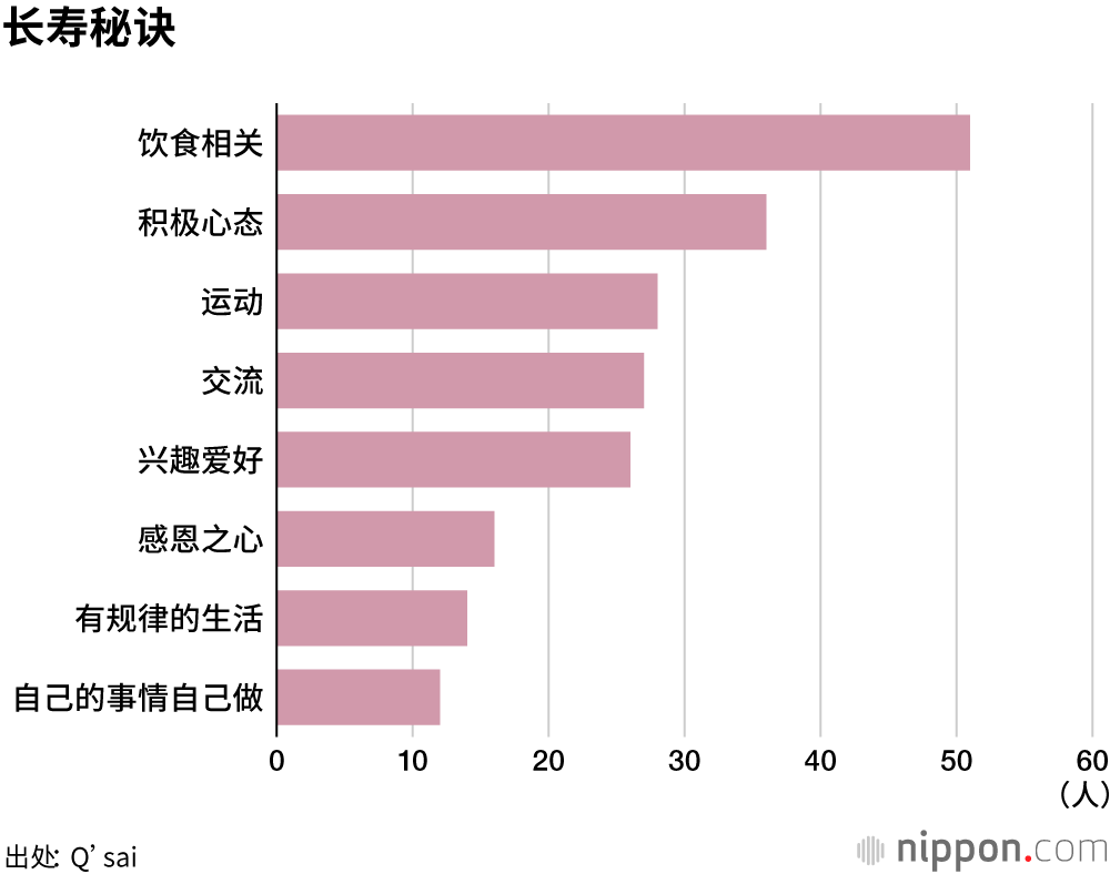 Q’sai(总部位于福冈市)公司从2016年起,通过每年对100名100岁以上老人(卧床不起和住院的老人除外)及其家人的询问了解,调查掌握了健康百岁老人的实际生活情况。 2021年5月到7月期间,该公司实施了今年的百人调查。关于“长寿秘诀”,半数以上(51名)受访者选择了“不挑食”“坚持一天三顿”“多吃蔬菜”等选项,基本都与“饮食”有关。其中还有人“每晚要喝一杯酒”。另外,有36人回答“心态积极”“不纠结,一切向前看”。
