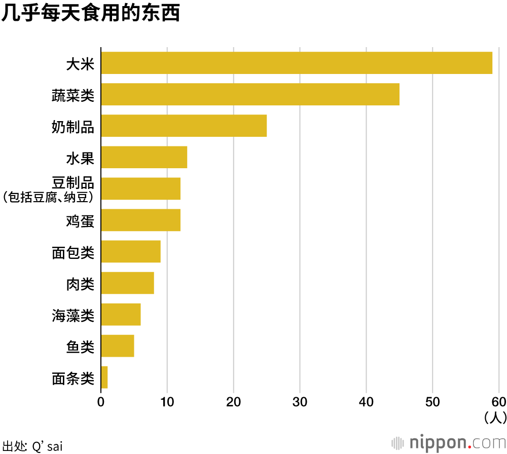 健康百岁老人的饮食方面,几乎每天都吃的是食物前三名分别是“大米”(59人)、“蔬菜”(45人)和“奶制品”(25人)。大米是能量来源,蔬菜富含维生素和微量元素,从奶制品中可以摄取骨骼和牙齿所不可缺的钙质,许多长寿老人都养成了食用这些身体必需物质的习惯。