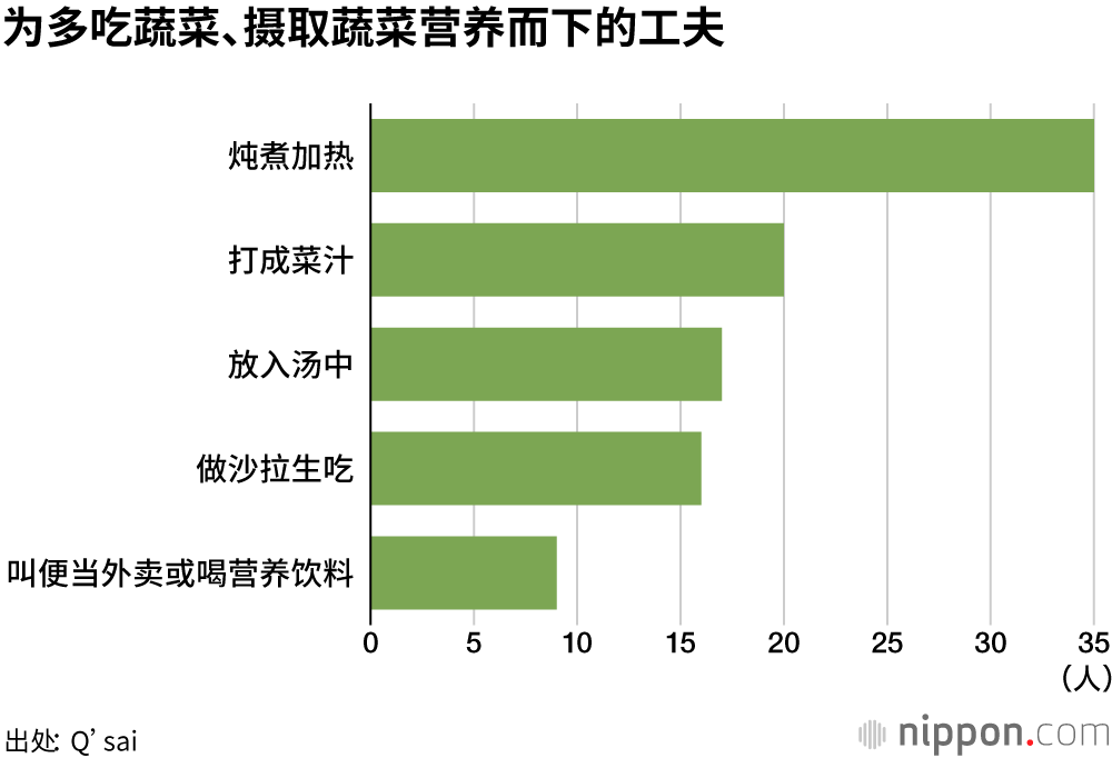 为了多吃蔬菜,许多老人将蔬菜炖煮加热,以方便咀嚼,也有人将蔬菜打成菜汁或放在汤里食用。