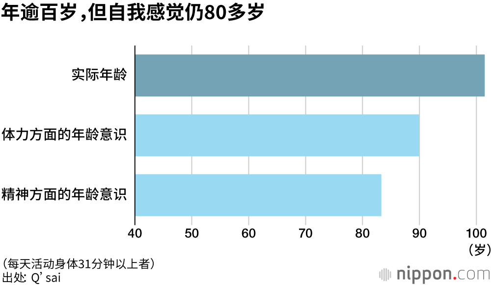 100名调查对象的实际年龄平均为101.45岁。当被问及年龄意识,也就是他们感觉自己多少岁时,那些每天做事等活动身体31分钟以上者,在“体力方面”感觉为89.9岁,“精神方面”感觉为83.3岁,也就是自我感觉比实际年龄年轻了10岁以上。