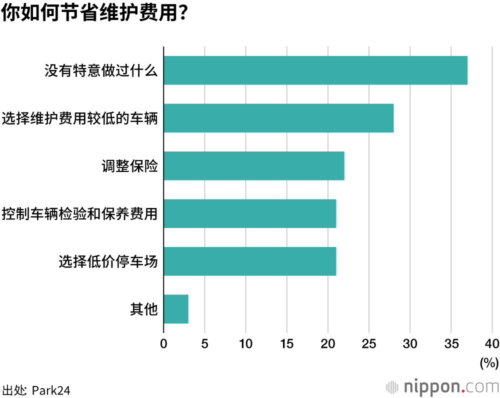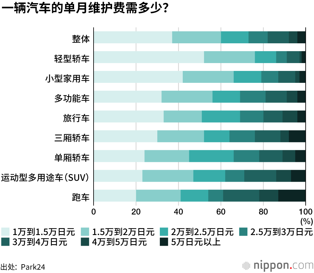 提供计时停车、共享汽车等服务的Park24公司针对用户实施的问卷调查(3542份有效回答)显示,私家车单月维护费用在“1万到1.5万日元”之间的受访者最多,占比为34%,“1.5万到2万日元”的占比为23%,单月维护费用在2万日元以下的受访者占到了半数以上。