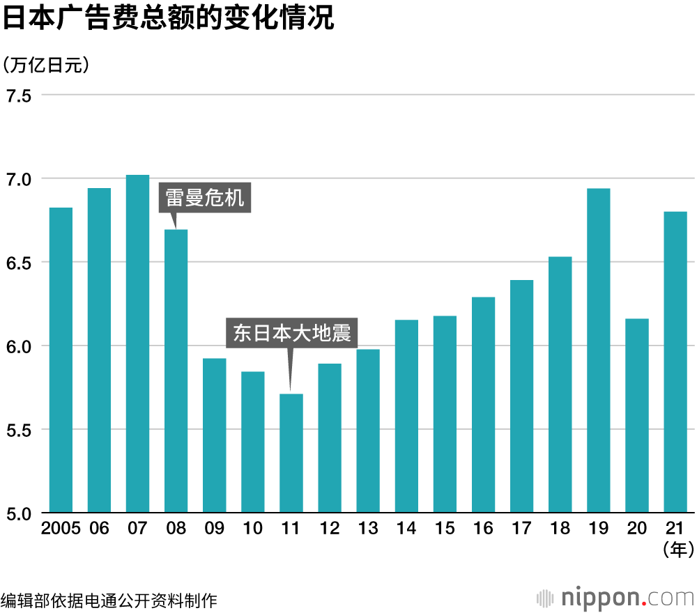 电通公司每年实施的调查显示,2021年日本的广告费总额为67998亿日元,同比增长10.4%,时隔两年再次转为正增长。受新冠疫情影响,2020年的广告费总额录得9年来的首次负增长,但2021年下半年企业复工复产、东京奥运及残奥会等大型活动的举办成为了拉动广告费增长的重大积极因素。