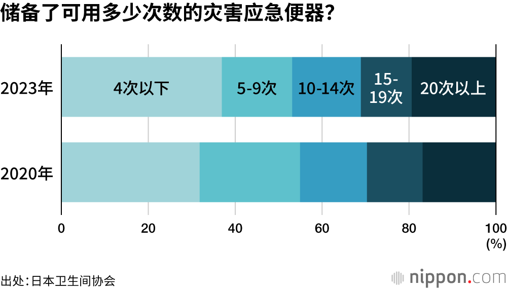 关于灾害应急便器的人均储备数量,选择“4次以下”的受访者最多,占比为36.9%,“20次以上”的占比仅为19.4%,而日本经济产业省建议的人均储备量则为35次以上。今年是关东大地震发生100周年,希望大家都能重新审视一下自己的灾害应急储备。