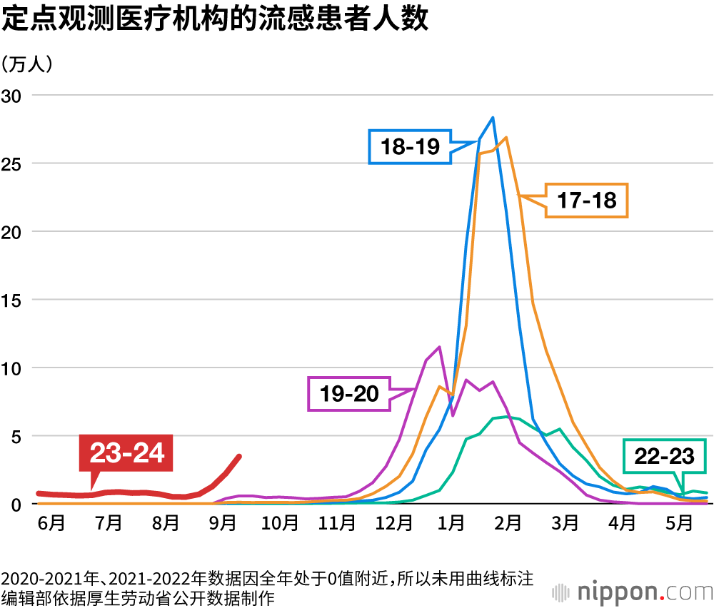 往常年份,流感患者大多从11月前后开始缓慢增多,天寒地冻的12月到1月期间进入高发期。但今年的情况不同于往年,始于2022年末的流感疫情一直持续到2023年夏季仍未平息,马上又将迎来新的高发期。通过图表可以看出,今年感染人数开始增多的时间比往年提前了两三个月。