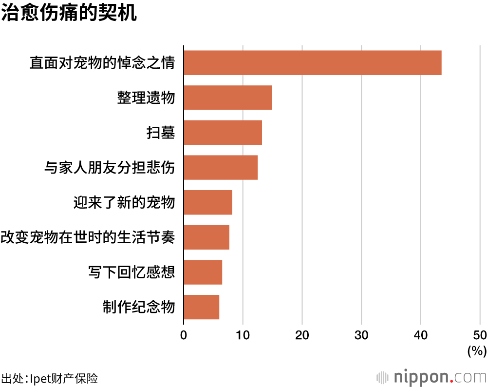 关于治愈伤痛的契机,43.5%的受访者选择了“直面对宠物的悼念之情”。似乎许多人都试图通过直面内心的悲伤来度过失去宠物的难关。其次是“整理遗物”(14.9%)、“扫墓”(13.2%),这些行为也可以说是为了接受失去宠物的现实。