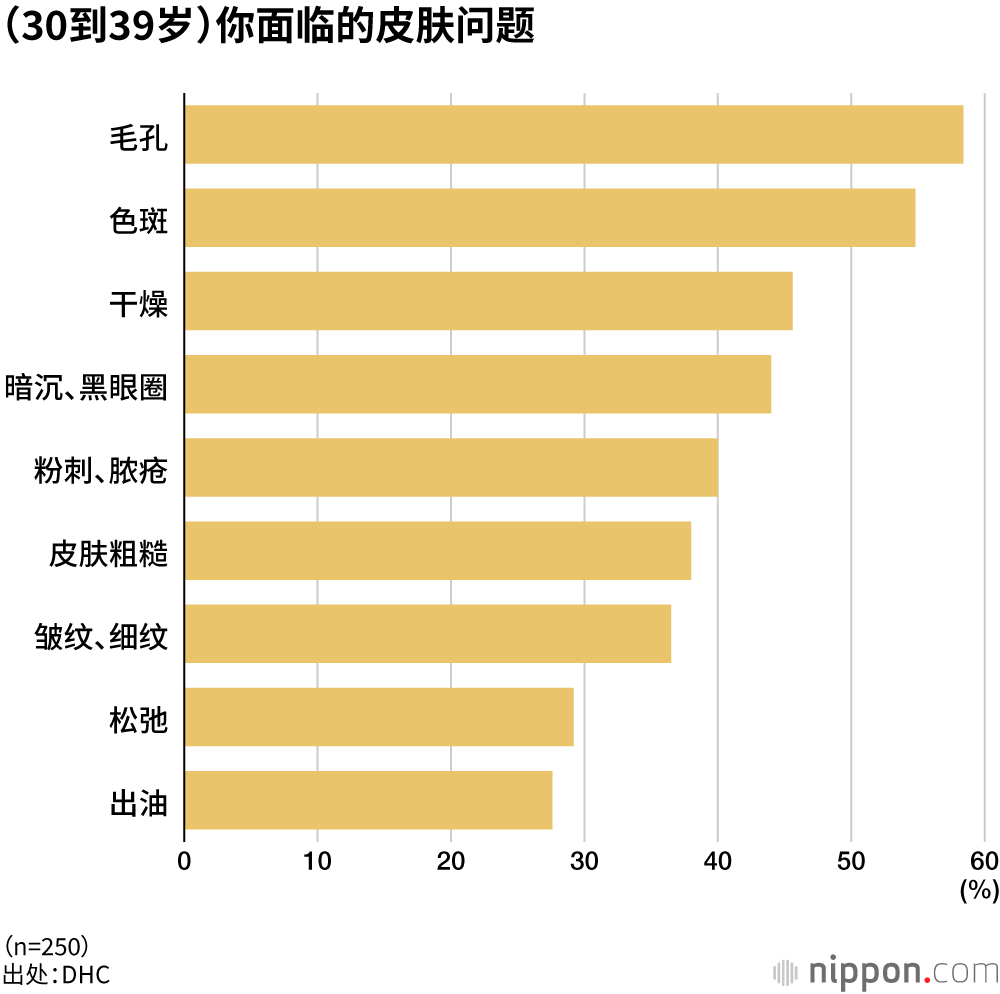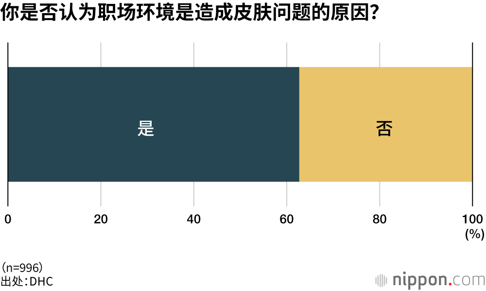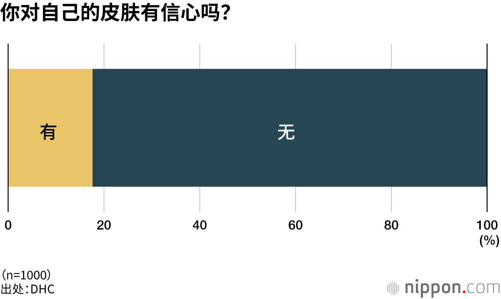 化妆品制造销售企业DHC(总部位于东京都港区)针对1000名20到59岁的职场女性进行了一次有关皮肤问题的意识调查。仅有17.6%的受访者表示“对自己现在的皮肤有信心”,超过80%的受访者都缺乏自信。