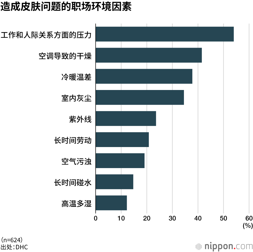 整体上有63%的受访者认为造成皮肤问题的根源在于“职场环境”。其中,提到“工作和人际关系方面的压力”的人最多,占比为54.0%。
