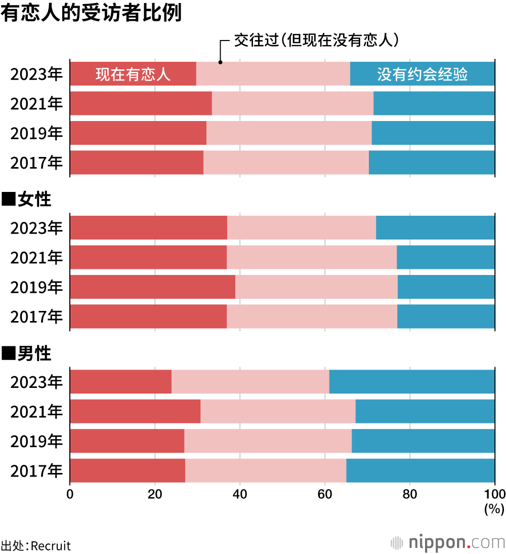 人力资源巨头Recruit实施的调查显示,如今不止是未婚、不婚的问题突出,单身男女中“没有约会经验”的比例甚至也达到了34.1%。难道想要遏制少子化的发展已经毫无希望?