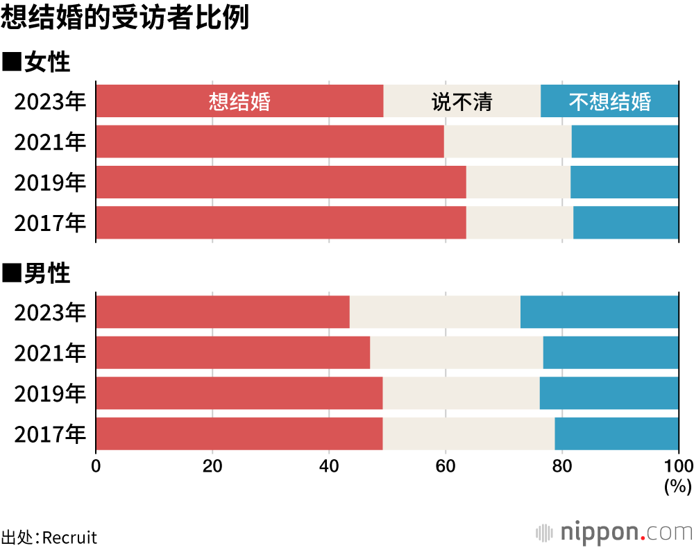 “(始终还是)想结婚”的女性受访者比例为49.3%,男性为43.5%,均跌破了半数。虽然女性受访者“想结婚”的比例高于男性,但较上一次调查出现大幅下降。