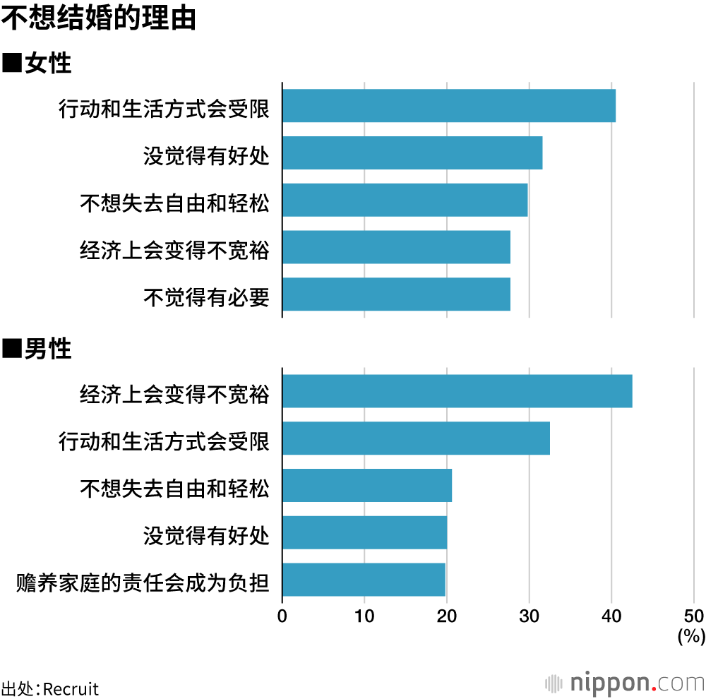 关于不想结婚的理由,女性受访者中选择“行动和生活方式会受限”的人最多,占比为40.5%,男性受访者中选择“经济上会变得不宽裕”的人最多,占比为42.5%。女性对自由受限更具排斥倾向。
