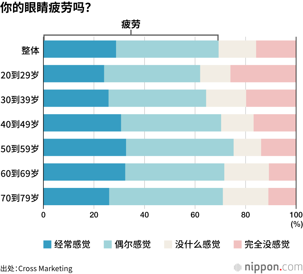 Cross Marketing(东京都新宿区)2023年11月对2400名20到79岁民众实施的调查显示,29%的受访者最近一个月“经常觉得眼睛疲劳”,41%“偶尔觉得眼睛疲劳”,合计有70%的受访者切身感觉到了眼睛疲劳的问题。尤其是50到59岁的受访者中,几乎四分之三(76%)的人都有这种感觉。这或许和老花眼的加剧也有关系。