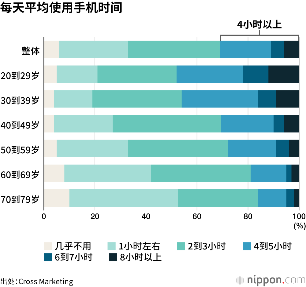 听到“眼睛疲劳”,大家首先就会想到“手机”。针对使用智能手机的受访者询问他们平日和假日每天的平均使用时间时,整体上回答“2到3小时”的人最多,占比为36%。各年龄段的该比例也都在30%到40%之间。回答“8小时以上”的整体比例也有6%,20到29岁人群的该比例更是达到了12%。概括而言,20到29岁、30到39岁这两个年龄段,平均每两人中就有一人每天使用手机的时间超过4小时。