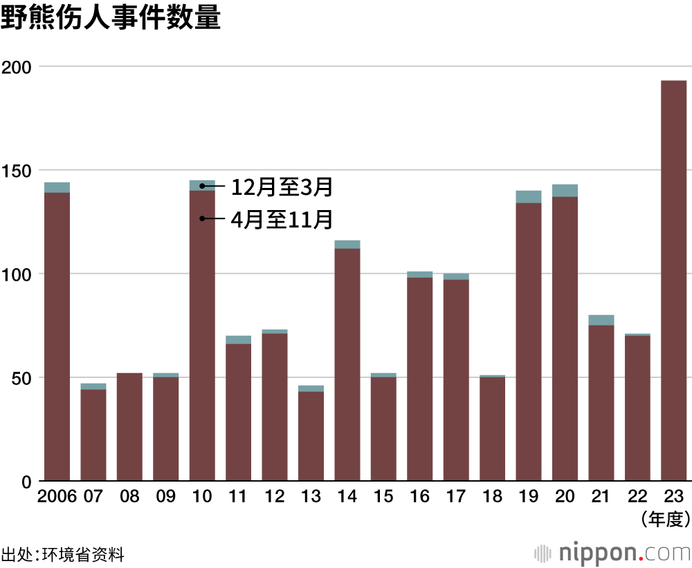 2023年度4月至11月末,共计发生193起熊类伤人事件。受害人数为212人(其中6人死亡),创下自开始按月统计的2006年度以来的历史最高纪录。从近年来全年伤人事件超过100起的2019年度、2020年度、2023年度的情况来看,伤人事件的高发期均在10月。