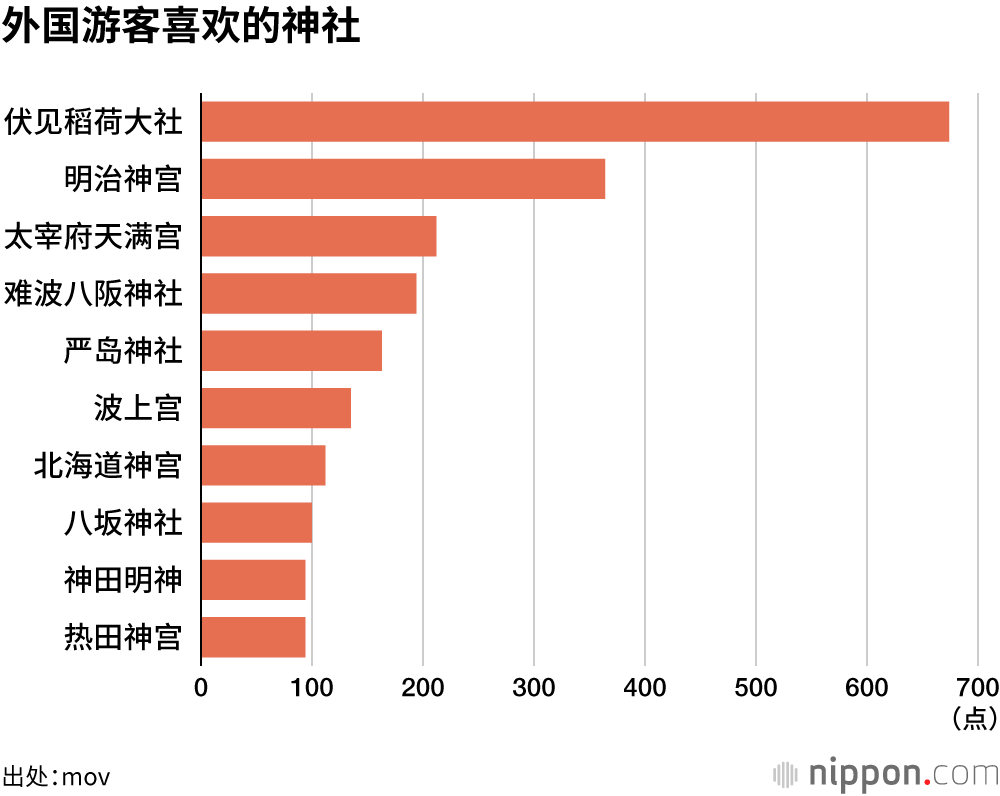 第二名开始依次为明治神宫(东京都)、太宰府天满宫(福冈县)、难波八坂神社(大阪府)、严岛神社(广岛县)、波上宫(冲绳县)、北海道神宫(北海道)、八坂神社(京都府)、神田明神(东京都)、热田神宫(爱知县),可以看出,受欢迎的神社较为均匀地分布在日本各地。