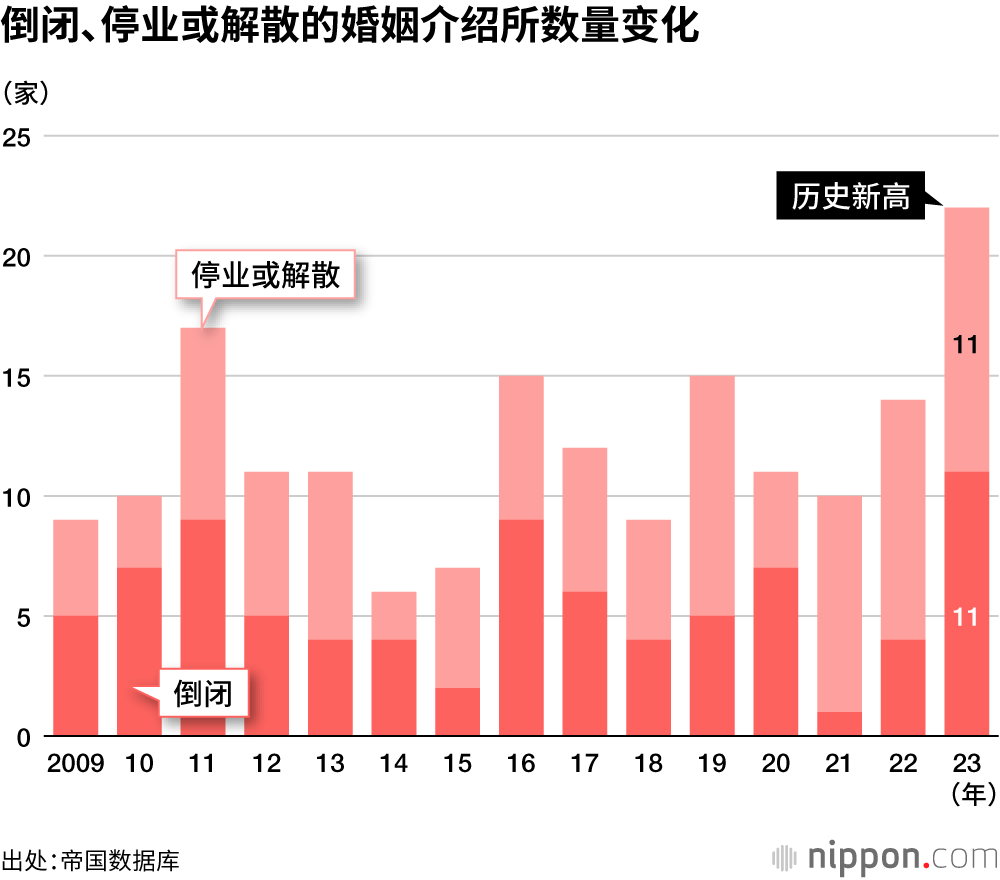 调查机构帝国数据库公司发布的数据显示,2023年有11家介绍婚恋对象的婚姻介绍所倒闭,创历史新高。另有11家停业或解散,也创下了历史新高。