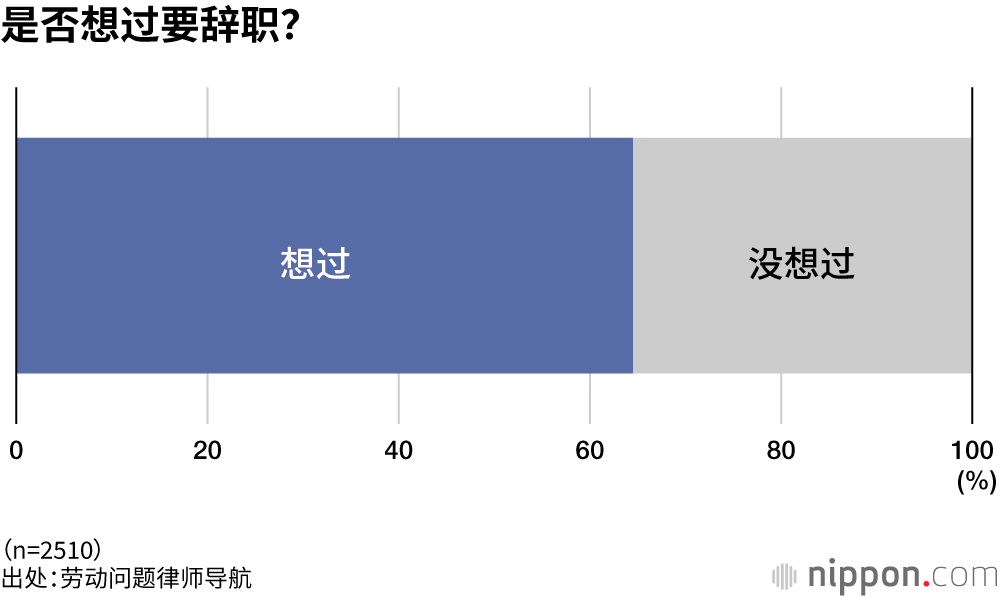 聚焦劳动问题的法律咨询网站“劳动问题律师导航”实施的调查显示,针对“是否想过要辞职”这个问题,64.6%的受访者表示“想过”,35.4%表示“没想过”。