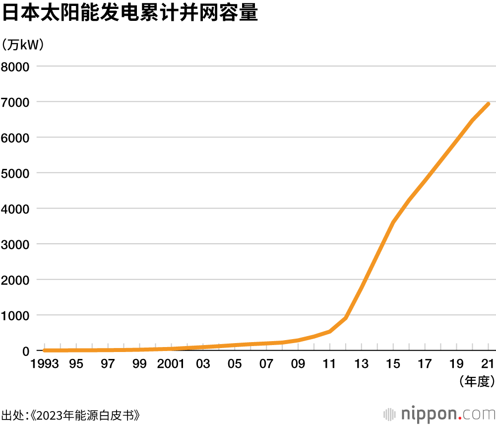 2023年《能源白皮书》显示,最新数据的2021年国内太阳能发电并网容量累计达到6935万千瓦。2011年的并网容量推定约为500万千瓦,2012年推行FIT制度后,除了家庭住宅太阳能发电系统外,大规模的“百万瓦级太阳能”发电站也实现了快速发展。技术进步促使设备成本下降,这也产生了推波助澜的效果。