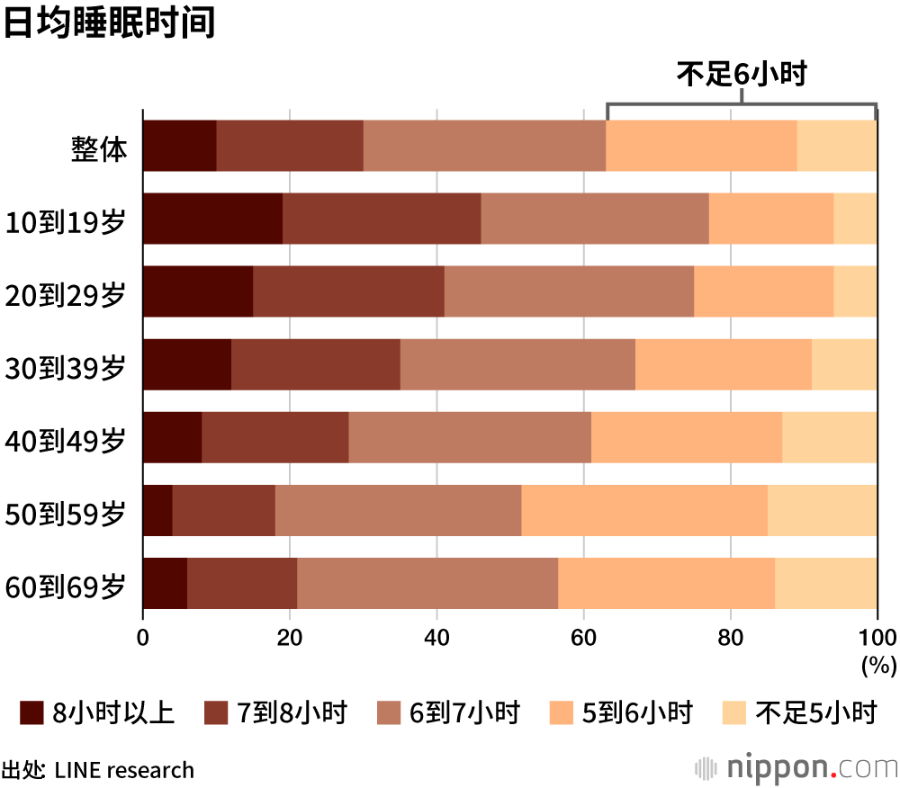睡眠不足导致的注意力不集中是造成事故的元凶之一,慢性失眠会导致抑郁症和生活习惯病的加重,睡眠对身心健康影响重大。连我雅虎公司实施的调查显示,睡眠时间不足6小时的受访者中,以50到59岁人群占比最高。