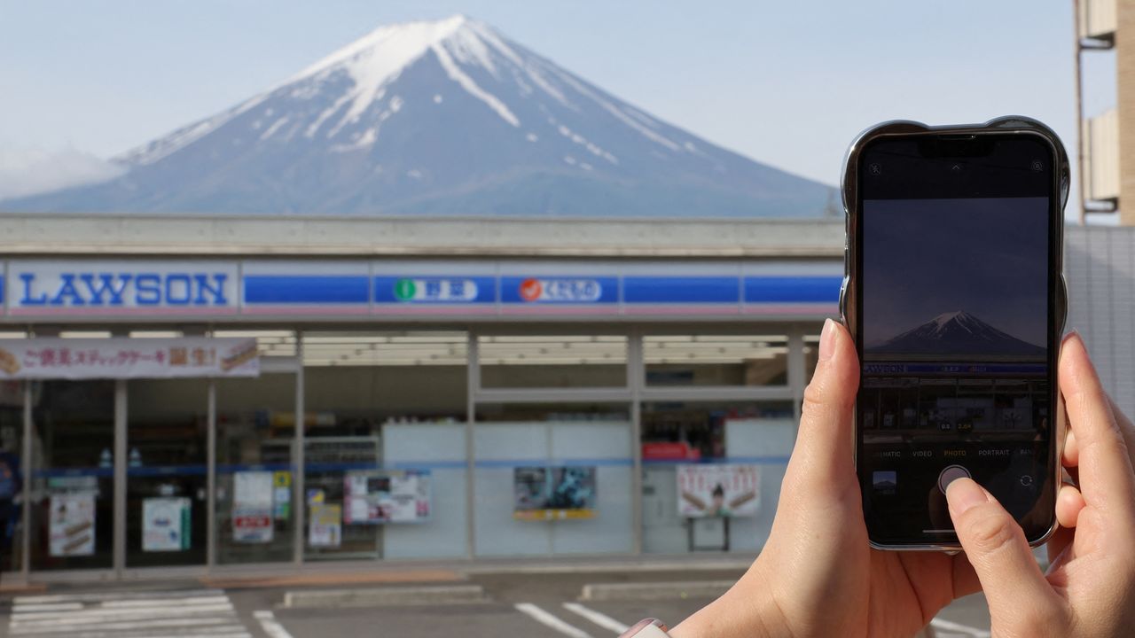 标题图片:以便利店远方的富士山为背景自拍的游客。这个人气拍摄景点吸引来大量游客,以致便利店前现已拉起了阻挡拍照的黑色幕布,2024年5月,山梨县富士河口湖町(路透社)