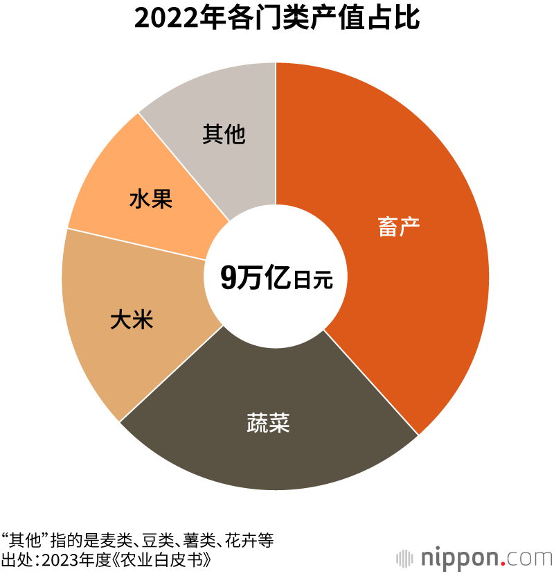 各门类的产值如下图所示。畜产居首,产值为3.5万亿日元(38.5%),其次是蔬菜(2.2万亿日元,24.8%)、大米(1.4万亿日元,15.5%)和水果(0.9万亿日元,10.3%)。大米产值同比增加了1.8%,这是由于大米不再作为主食作物,导致了民间库存量减少,从而促使了交易价格的回升。