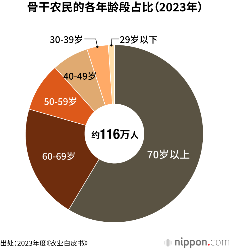 《农业白皮书》显示,2023年日本以农业为主要工作的“骨干农民”共有116.4万人,在最近20年间减少了一半。他们的平均年龄为68.7岁,49岁以下从业者仅占大约10%(13.3万人),老龄化问题持续加剧。