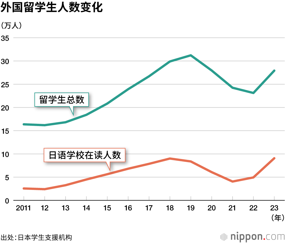 独立行政法人日本学生支援机构(JASSO)针对截至2023年5月1日的海外留学生情况进行调查后发现,日语学校在读留学生人数达到90719人,较上一年增加约4万人(增长83.6%),创下自2011年开始此项调查以来的历史新高。