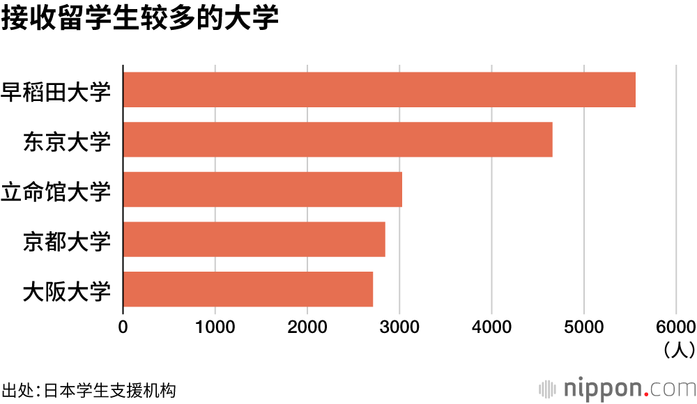 接收留学生最多的大学是早稻田大学(5560人),其次是东京大学(4658人)及立命馆大学(3027人)等。