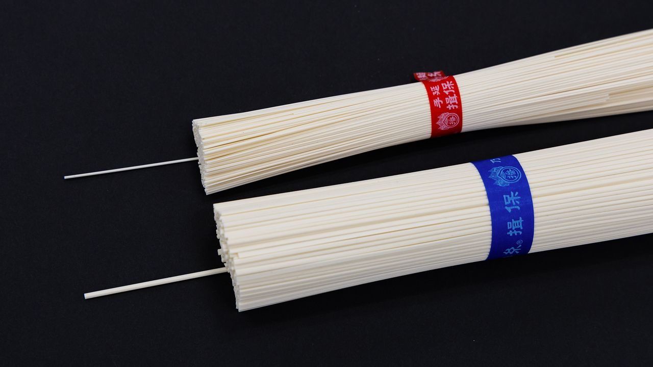 兵库县手擀素面工会出品的“揖保乃丝”是一款家喻户晓的高档品牌素面,普通版的直径也不到1毫米,大致在0.7到0.9毫米之间。礼品装豪华版的直径在0.55到0.6毫米之间,不到行业标准的一半,制作技艺可谓出神入化。