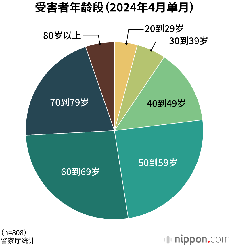警察厅对今年4月的808件案例进行分析的结果显示,受害者中男性占50.4%,女性占49.6%,几乎各占一半。受害者的年龄段方面,以60到69岁年龄段者为最多,占比26.9%;其次是50到59岁(24.4%)、70到79岁(20.5%)。
