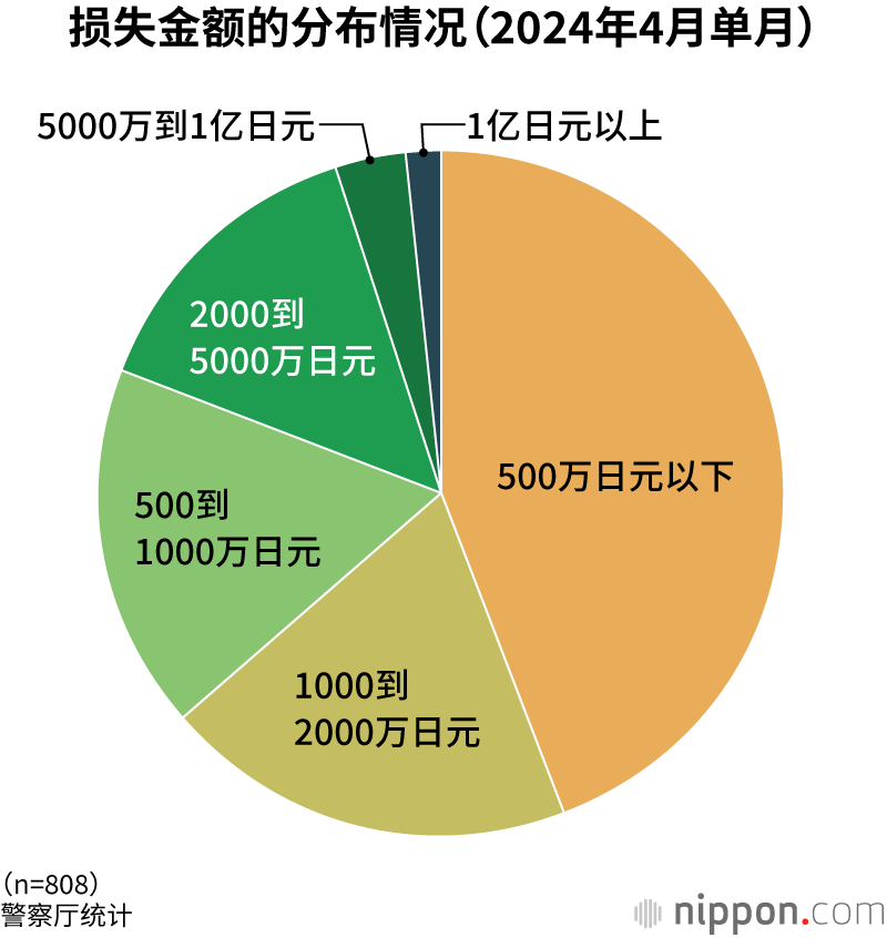 从损失金额来看,最多的是“500万日元以下”,占比为44.3%。另一方面,被骗超过1000万日元的占到了近40%,损失巨大的情况较为突出。仅4月一个月,就有11件损失金额超过1亿日元的案件。