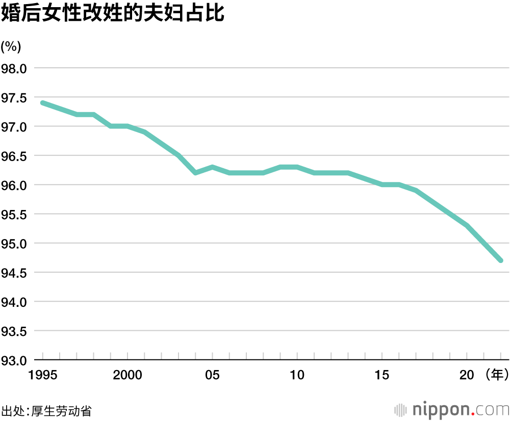 厚生劳动省的人口动态统计报告显示,2022年登记结婚的夫妇共有504930对。其中,478199对(94.7%)选择了夫姓,26731对(5.3%)选择了妻姓。