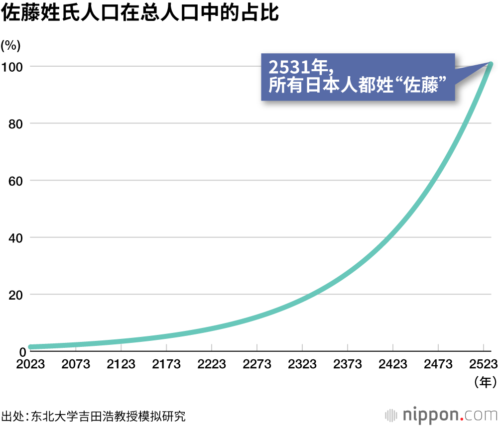 依据人口动态统计的数据,对结婚、离婚、出生、死亡几种情况造成佐藤姓氏人口发生的变化进行分析后发现,2022到2023年的一年间,佐藤姓氏人口增长了0.83%。如果假设佐藤姓氏人口一直保持这样的增速,那么到2446年会有一半日本人姓佐藤,大约500年后的2531年,所有日本人都会姓佐藤。