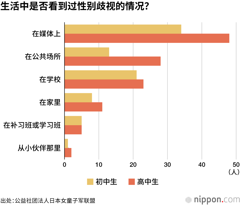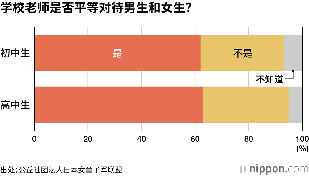 日本女童子军联盟针对中学女生实施的性别相关问题的调查显示,31%的初中生和32%的高中生感觉“学校的老师对待男生和女生的态度不平等”。