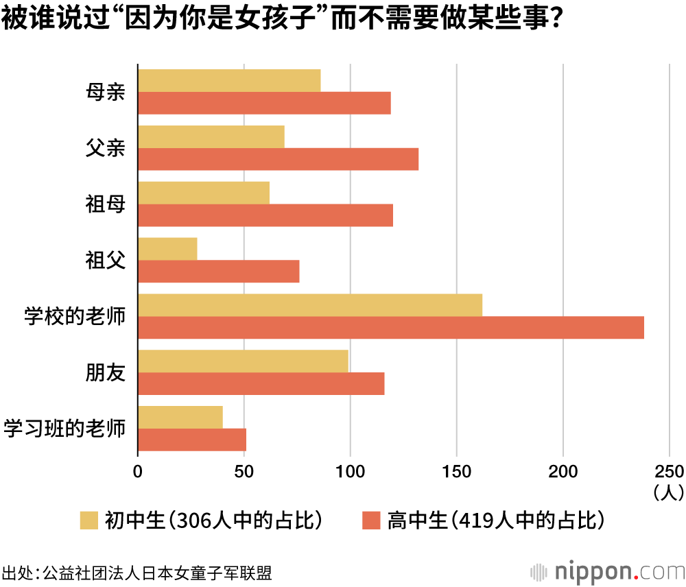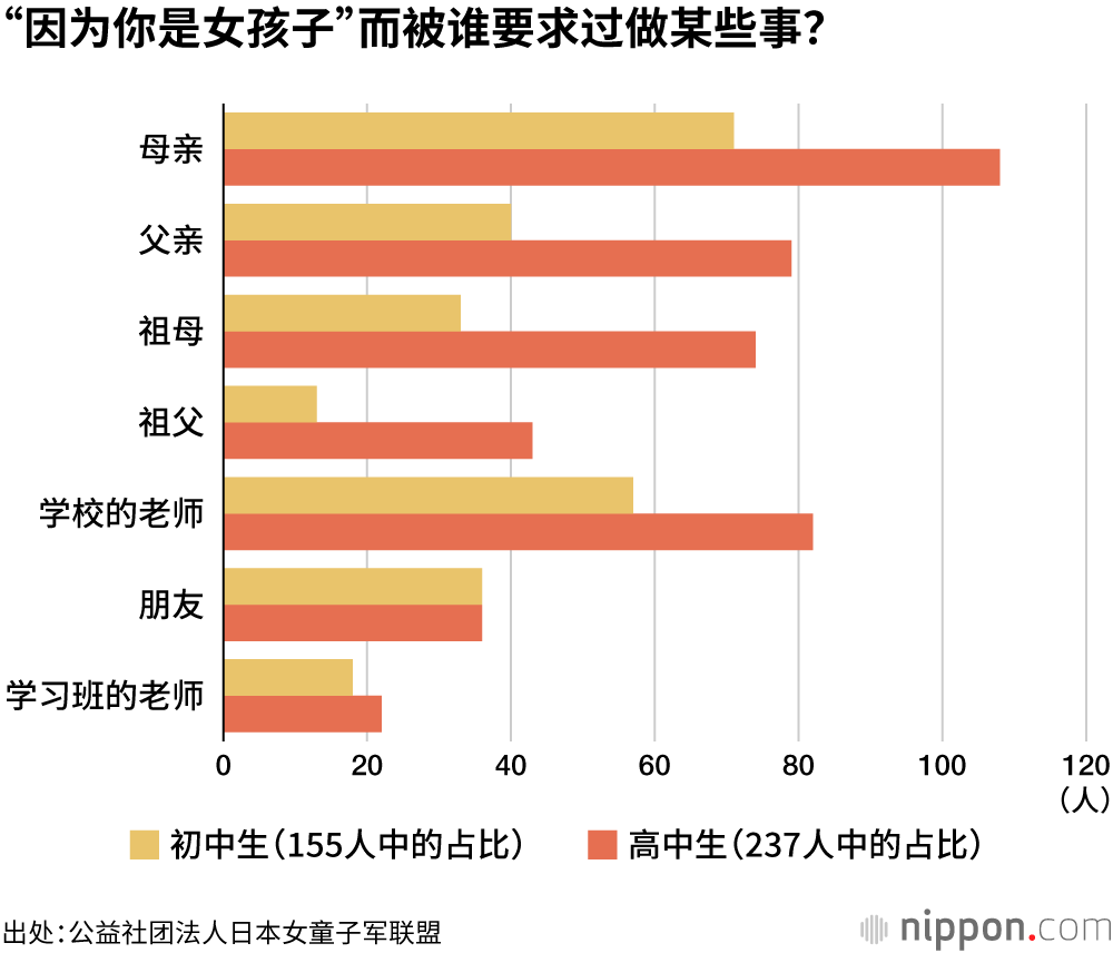 反过来,有20%的初中女生和30%的高中女生表示有过“因为是女孩子”而被要求做某些事的经历。无论初中还是高中生,表示被“母亲”和“学校的老师”要求过的受访者都比较多,高中生中列举了“父亲”和“祖母”的人也较多。