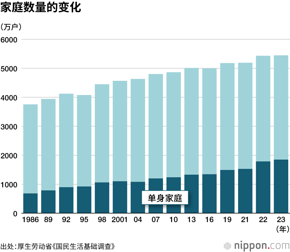 过去,“单身家庭”在日本属于少数派,而如今已变成第一大群体,2023年占到全国家庭总数的34%。