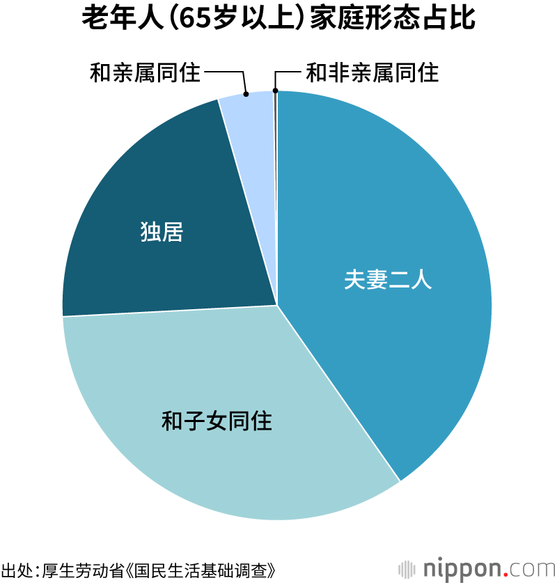 “老年人家庭”(家庭成员均为65岁以上人员的家庭)共计1656万户,占到整体的30.4%。其中大约半数为单身家庭,超过40%是“夫妻二人家庭”。独居老年人的性别方面,女性占到64.4%,男性为35.6%。