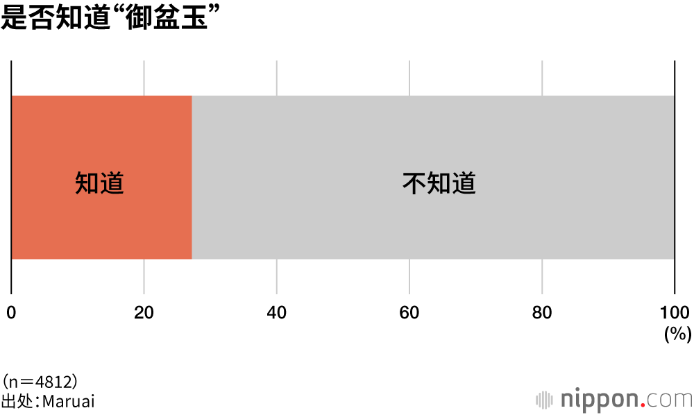 纸制品生产商Maruai(山梨县市川美乡町)针对4812名20岁以上民众实施的调查显示,关于“是否知道御盆玉”这个问题,27.2%的受访者表示“知道”,72.8%表示“不知道”。各年龄段的差异不大,但表示“知道”的受访者中,女性占了55.5%,认知度高于男性。