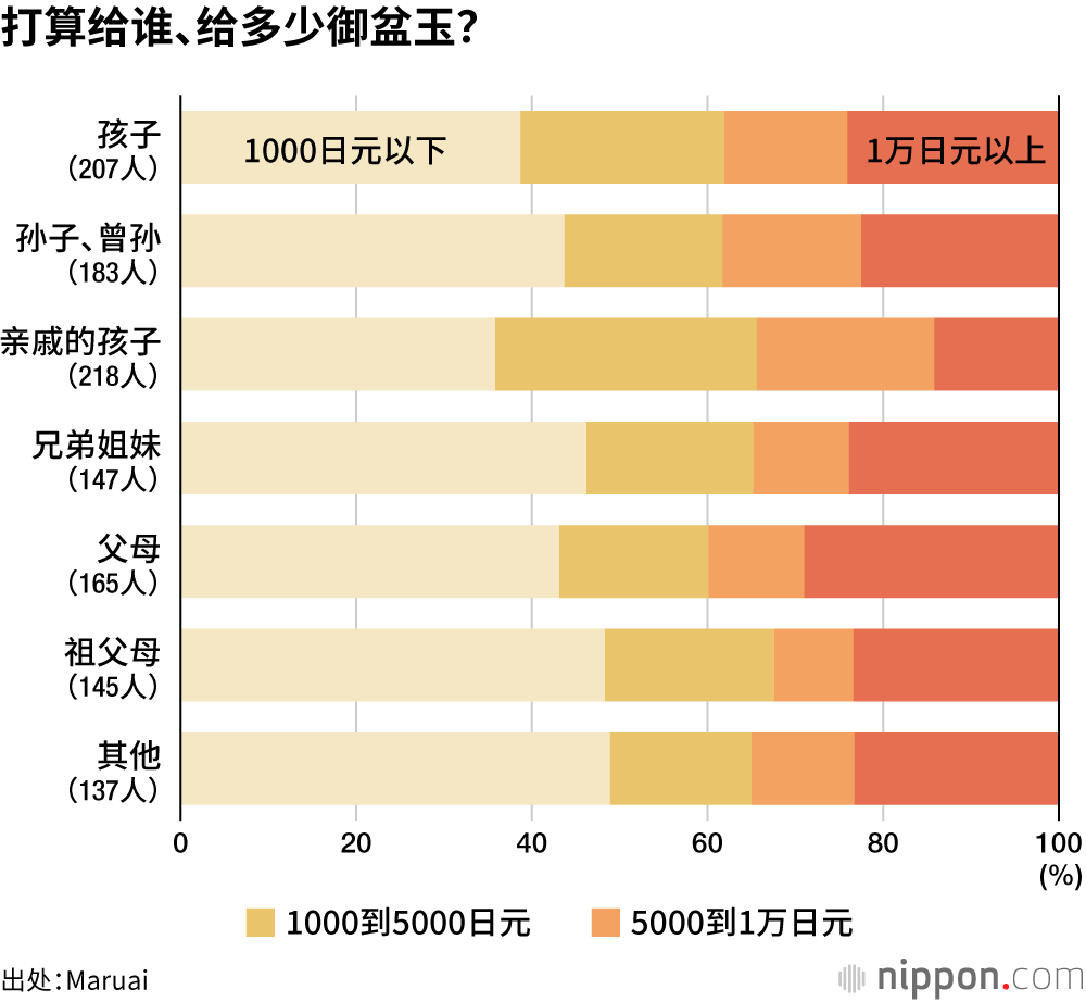 金额方面,打算给1000日元(人民币50元左右)以下当作零花钱的受访者较多,但针对“亲戚的孩子”以外的人,打算给“1万日元以上”的受访者比例超过了20%。其中,列举“父母”的受访者最多,占比达29.1%。由此来看,“御盆玉”似乎与新年给孩子们的压岁钱“年玉”,意义有所不同。