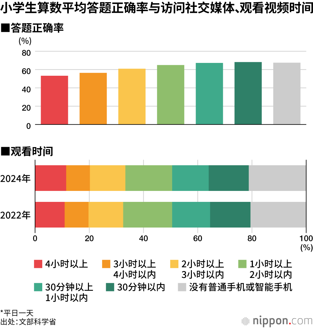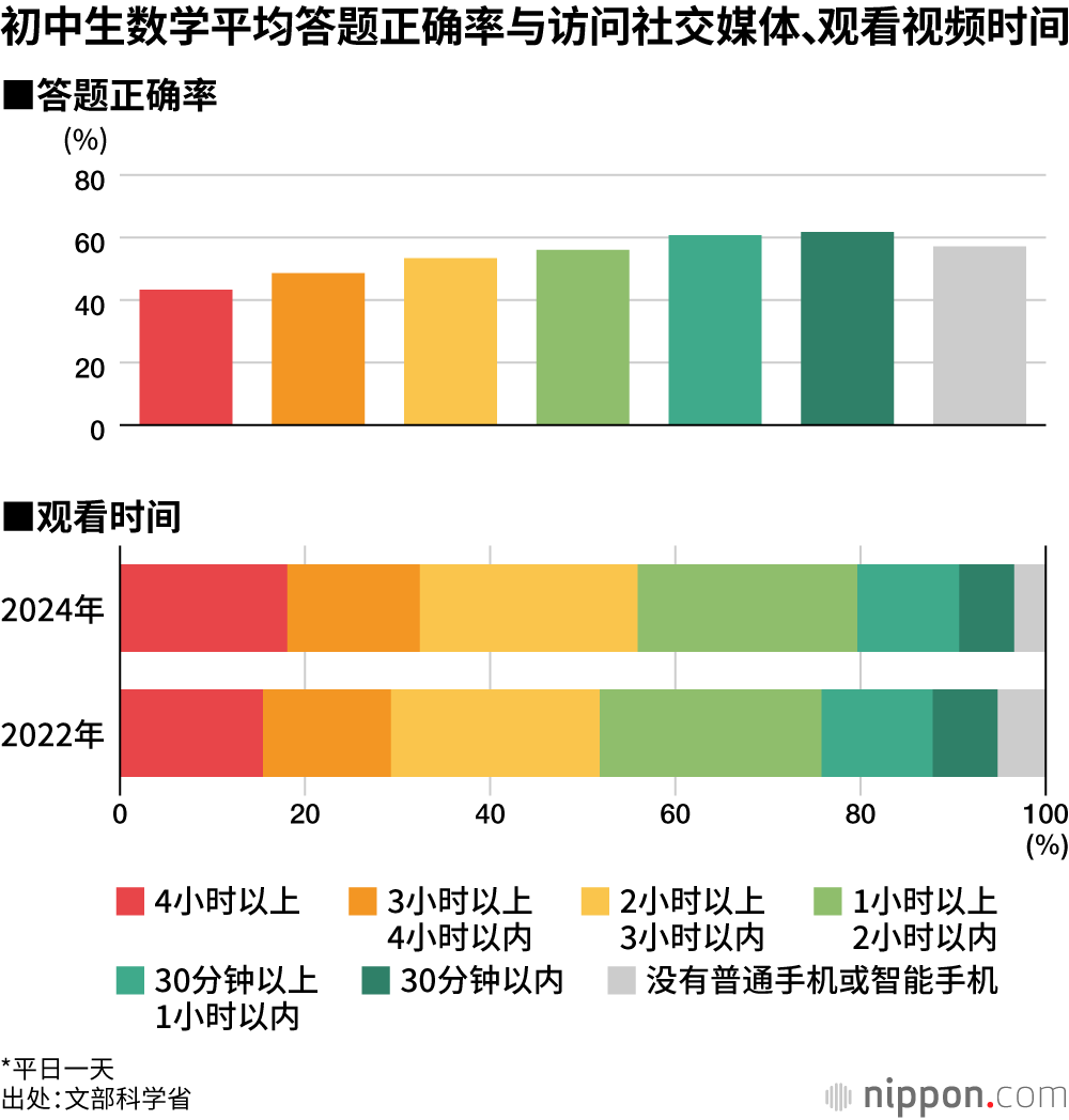 2024年4月针对全国六年级小学生和初三学生实施的问卷调查显示,他们花费在社交媒体和观看视频上的时间比2022年有所增加。此次调查是配合文部科学省2024年全国学力与学习状况调查(全国学力测试)一同实施的。访问社交媒体时间越长,学力测试的答题正确率往往就越低。