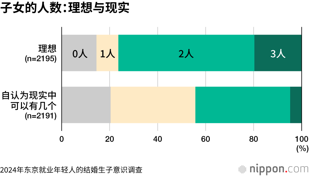 无论理想还是现实,年收入越高的受访者越倾向于选择更多孩子。年收入低于300万日元的受访者,认为理想数量是0个的比例达到了24.6%。