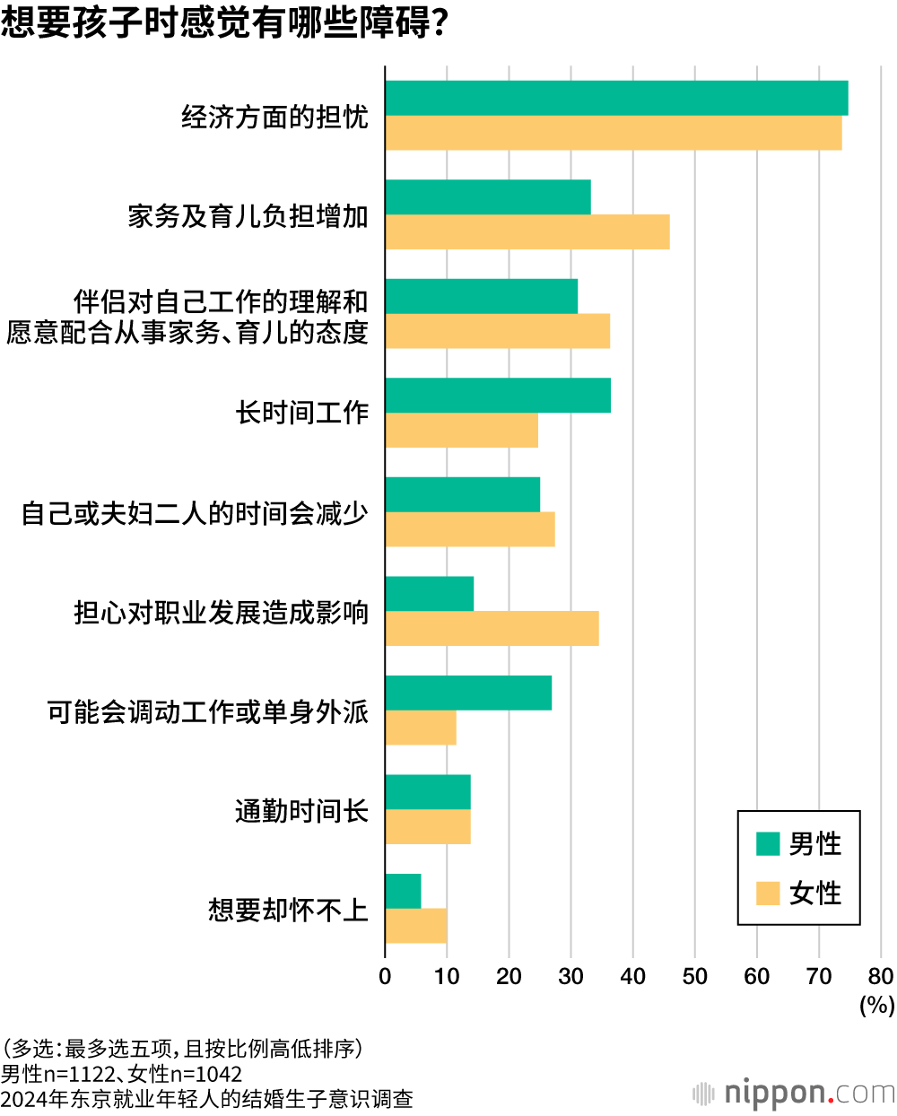 当被问及生育孩子的障碍时,整体上选择“经济方面的担忧”的受访者最多,占比达74.1%,远高于其他选项。选择“家务及育儿负担增加”的女性受访者较多,选择“长时间工作”“可能会调动工作或单身外派”的男性受访者较多,从中可以看出性别角色的分工意识。另外,表示“担心对职业发展造成影响”的女性受访者也明显多于男性受访者。