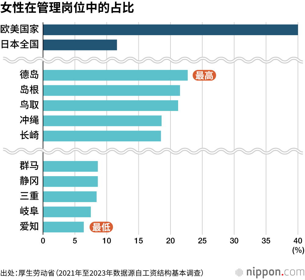 从女性在管理岗位中的占比来看,欧美国家达到40%左右,而日本大幅落后,仅为11.6%。从各都道府县排名来看,爱知县最低,仅为6.4%。略高于爱知县的多为岐阜、三重、静冈等中京圈(即名古屋都市圈——译注)和东海地区(包括爱知县、岐阜县、三重县和静冈县——译注)的自治体。