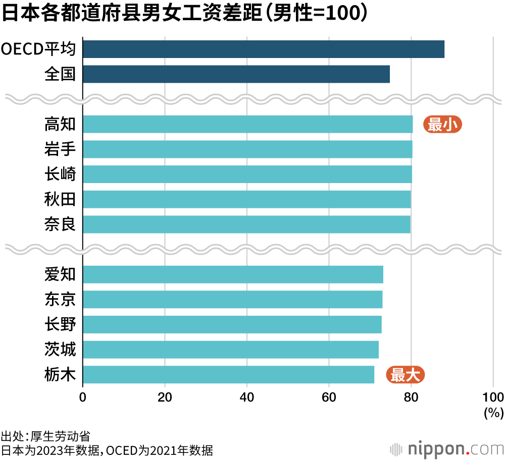 结果显示,男女工资差距最大的是枥木县(71.0%),差距最小的是高知县(80.4%),两县相差近10个百分点。东京都(73.0%)的男女工资差距第四大,全国平均值为74.8%。经济合作与发展组织(OECD)发达成员国的平均值为88.1%(2021年),可见日本的工资差距依然很大。