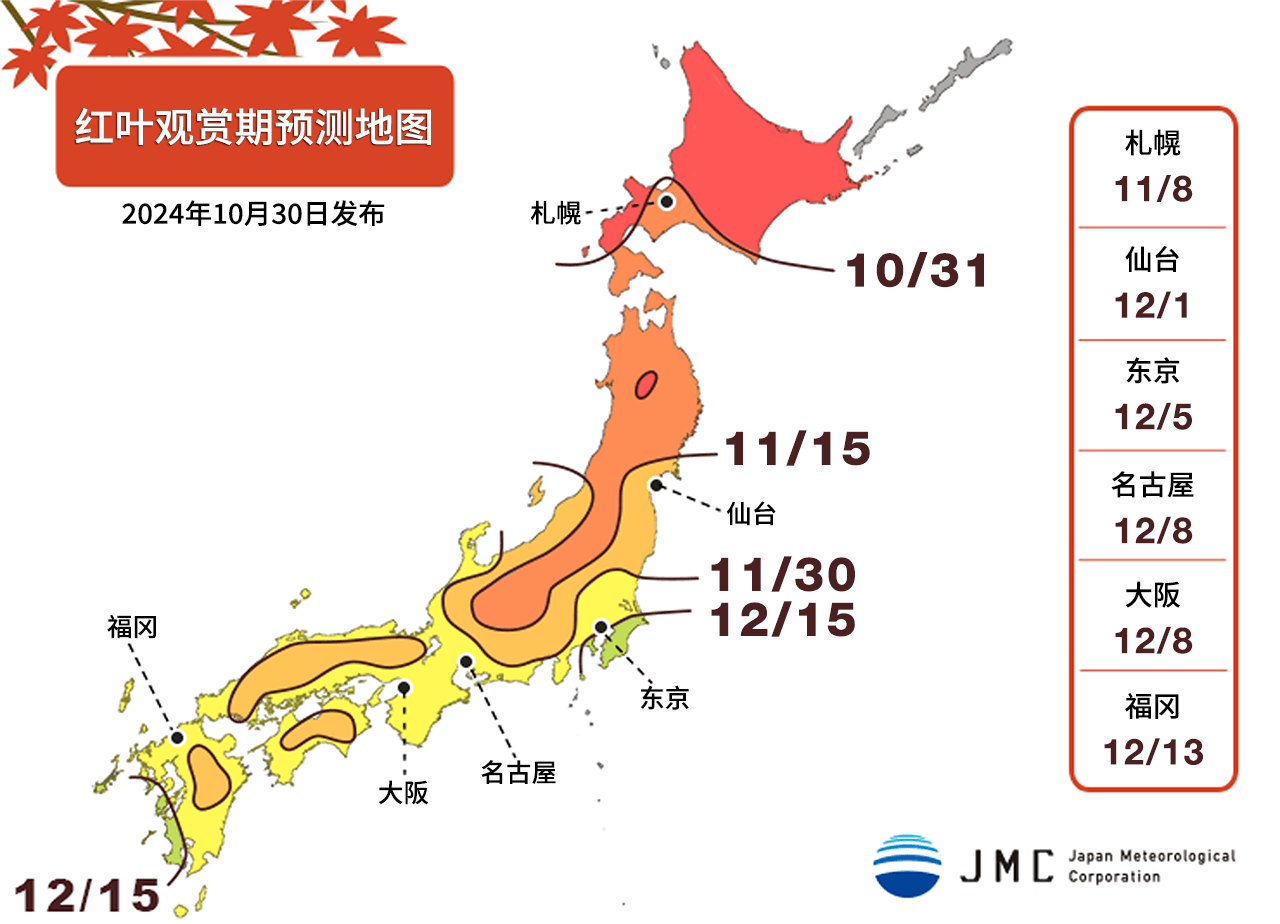 海拔较高的山区,树木已经开始落叶,但就平原地区来说,即便是北海道和东北北部,也要到11月以后树叶才会开始变红。东北以南地区则要等到12月以后。