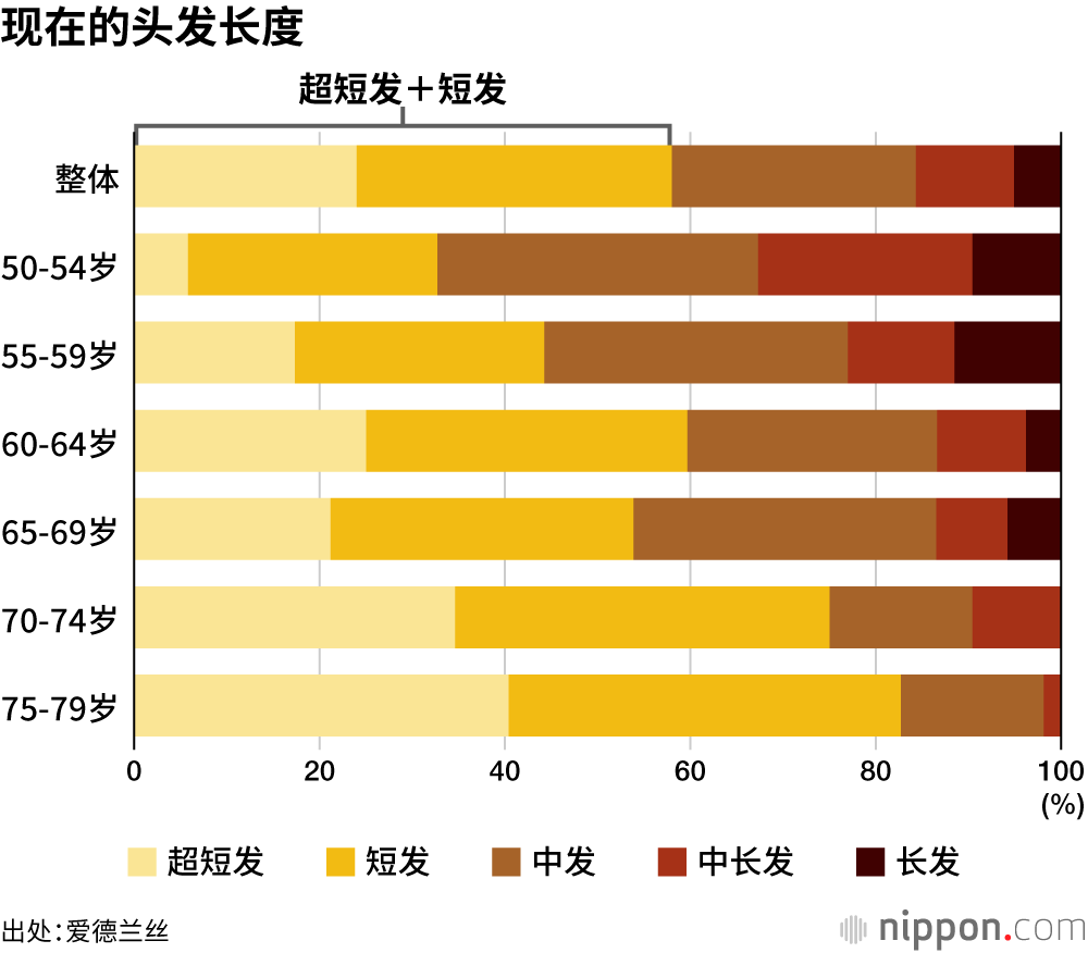 爱德兰丝公司(Aderans,东京都品川区)针对日本全国50到79岁女性实施的发型相关调查显示,头发长度为“短发”的受访者最多,占比为34.0%。从年龄段来看,50到54岁受访者中,大约有30%是“超短发或短发”,55到59岁受访者的该比例为40%,60到69岁超过50%,70到79岁更是达到70%以上,可以明显看出,年纪越大,越倾向于剪短发。