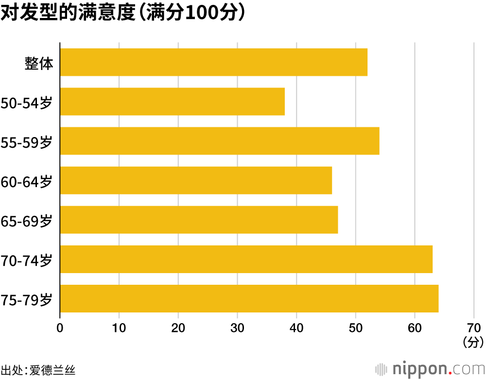 关于对目前发型的自我评分,整体上平均分值为52分(满分100分),可以看出多数女性对自己的发型并不满意。尤其是50到54岁这个年龄段的受访者,自我评分仅为38分,不满意度较高。