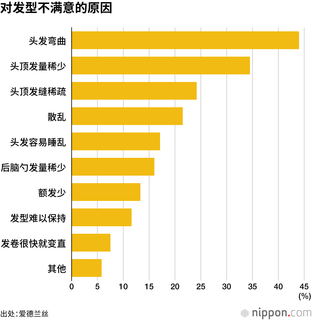 关于不满意的地方,回答“头发弯曲”的受访者最多,占比为44.0%,其次是“头顶发量稀少”(34.5%)、“头顶发缝稀疏”(24.2%)。从年龄段来看,60岁以上的受访者在意发量稀少和秃发的倾向明显。