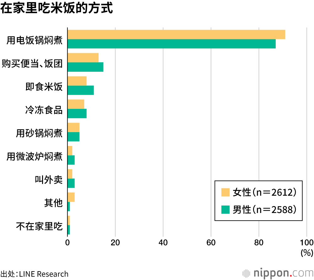 表示“用电饭锅焖煮”的受访者中,女性占比略高于男性,表示“购买便当、饭团”和“即食米饭”的受访者中,男性占比略高于女性。